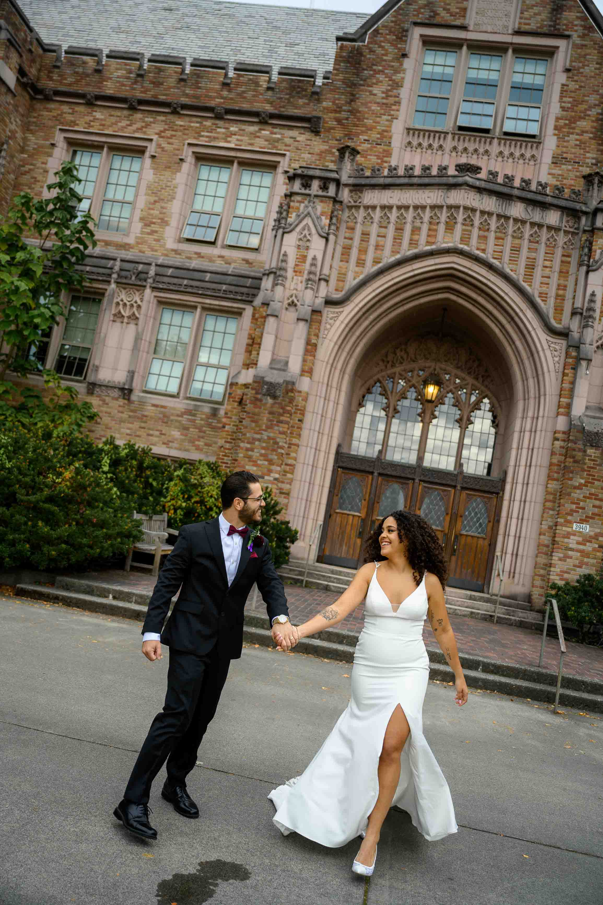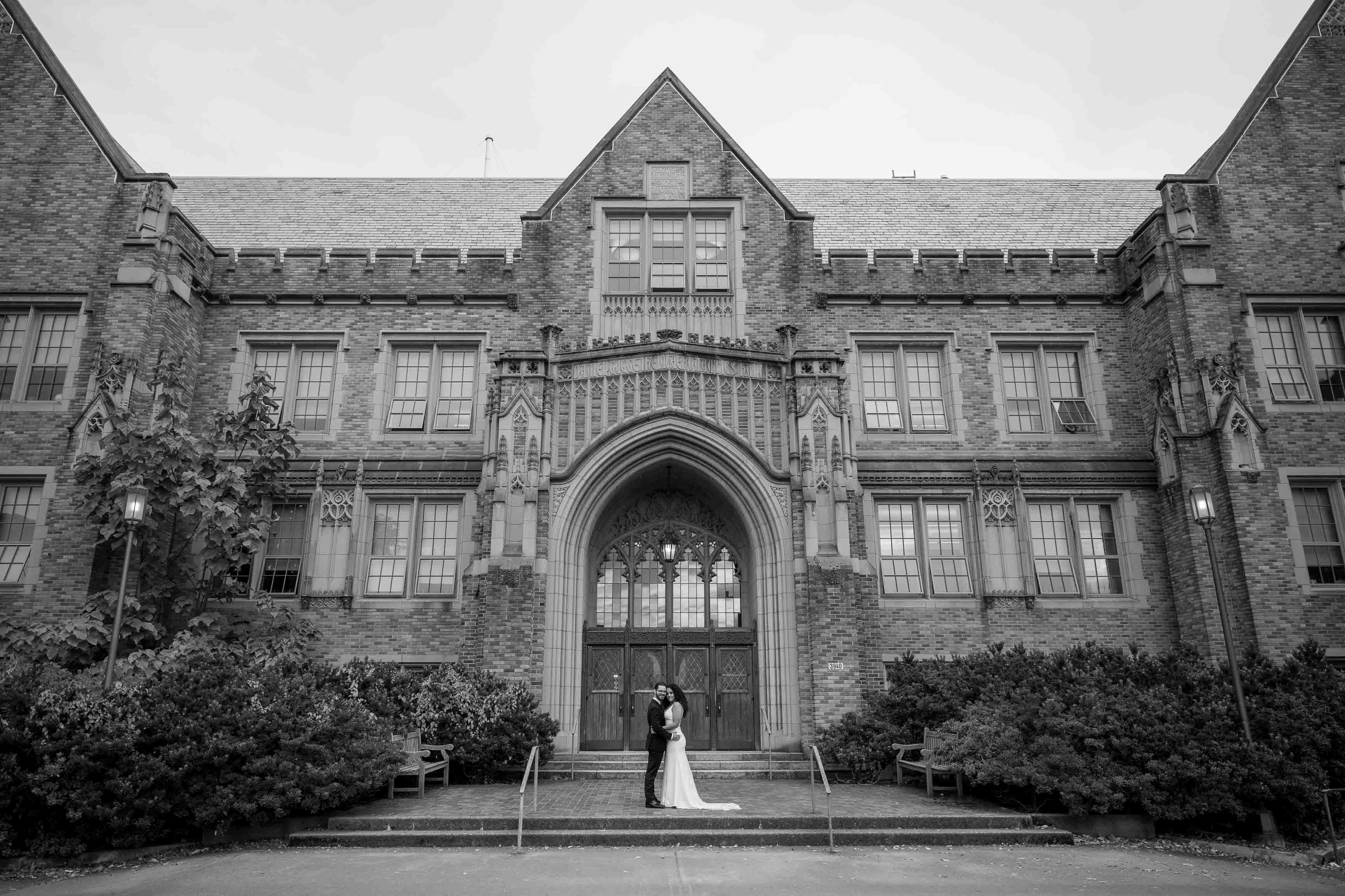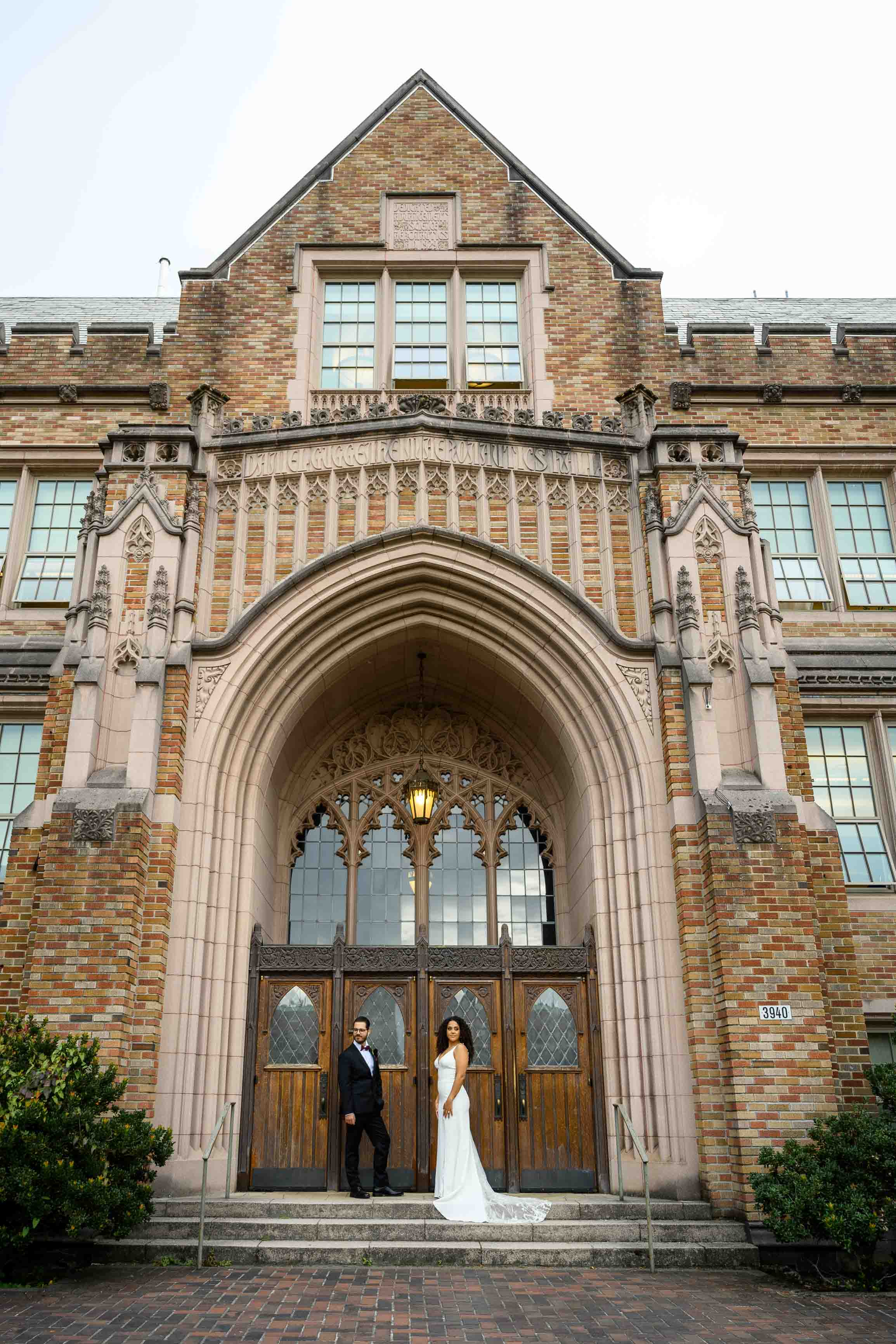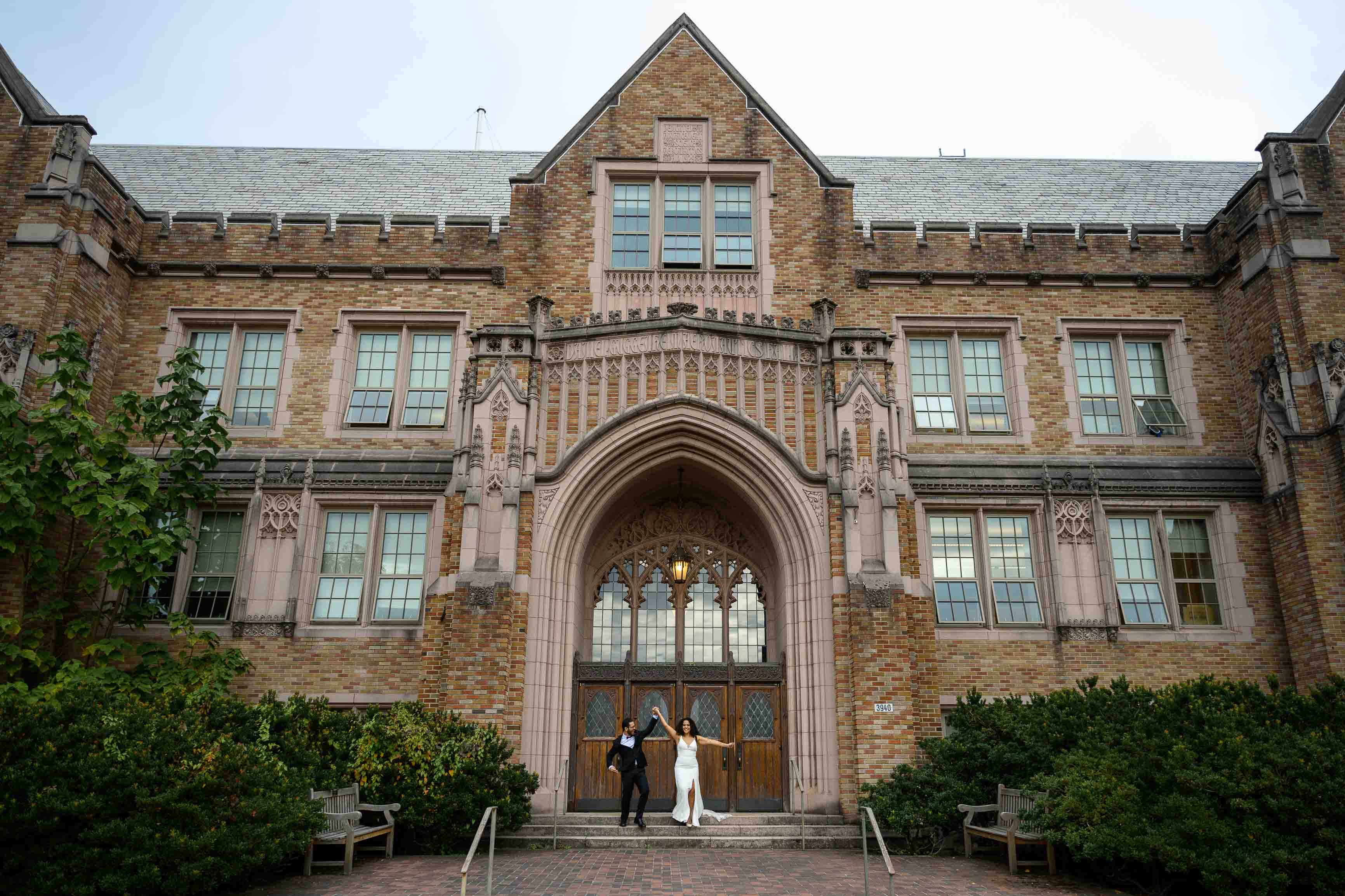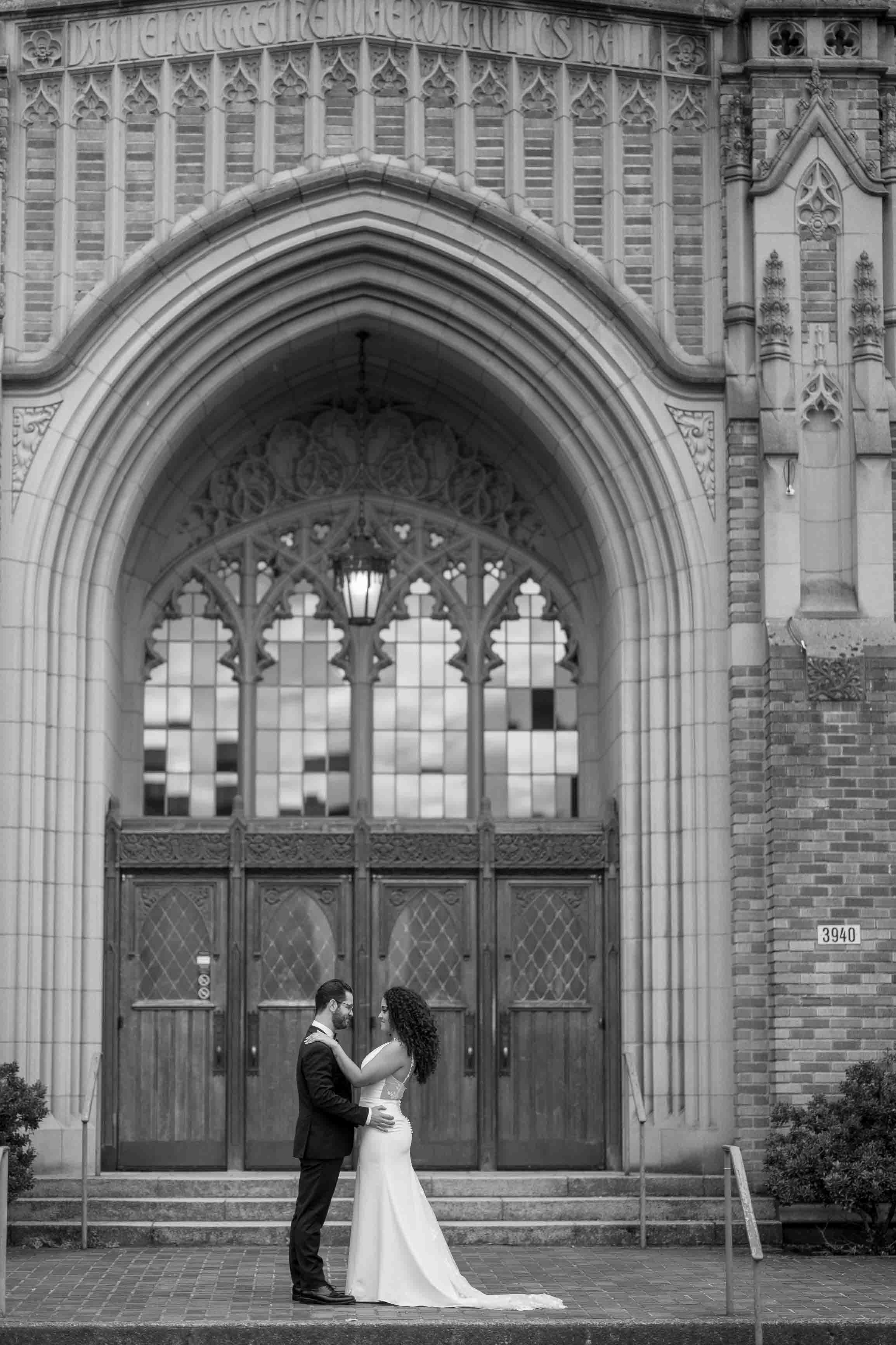 From there, we headed to the University of Washington campus for portraits. The shift from the beach to the architecture was seamless and added so much variety to their gallery. The campus offers a mix of historic buildings, quiet walkways, and unique vantage points that feel elevated without being formal.