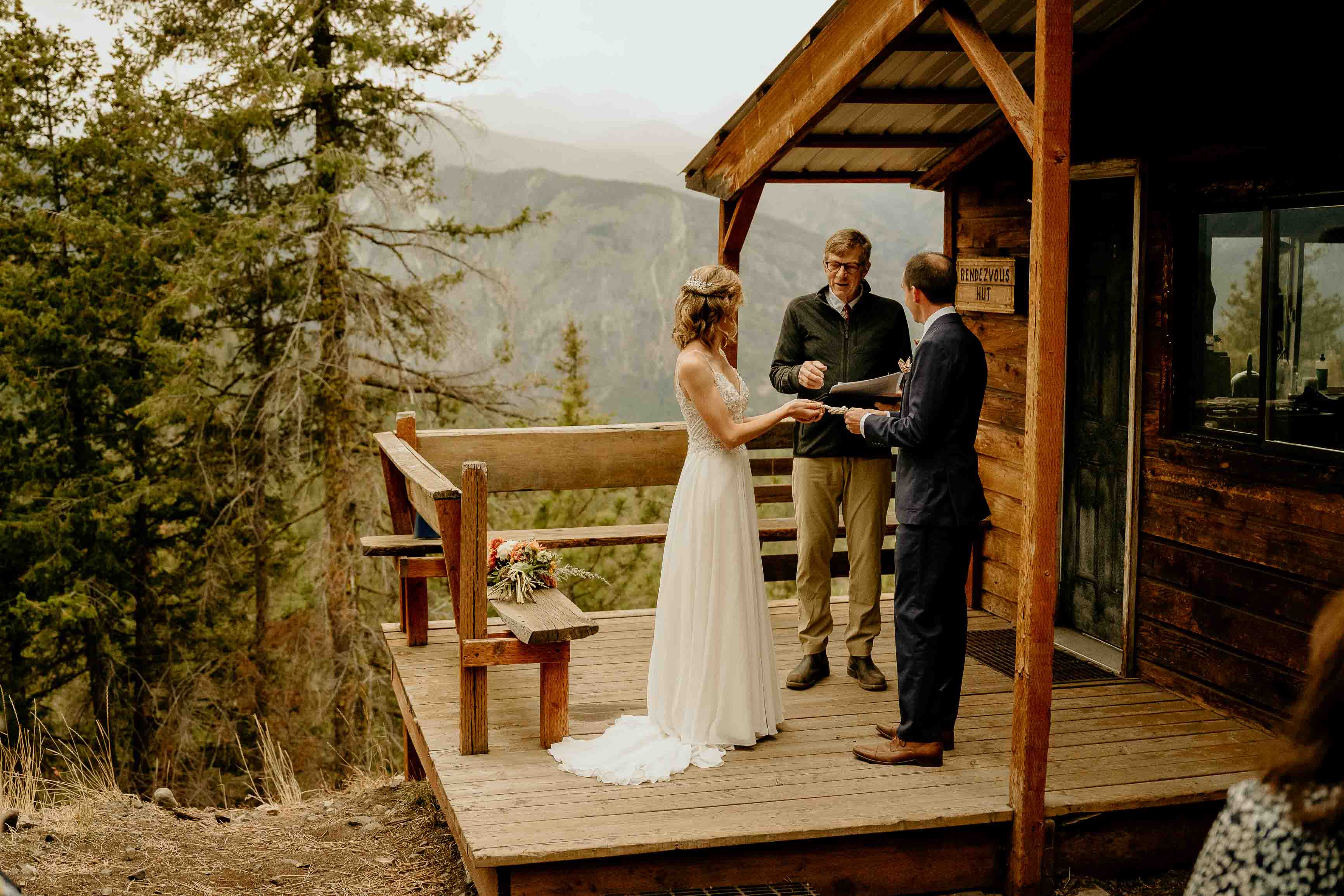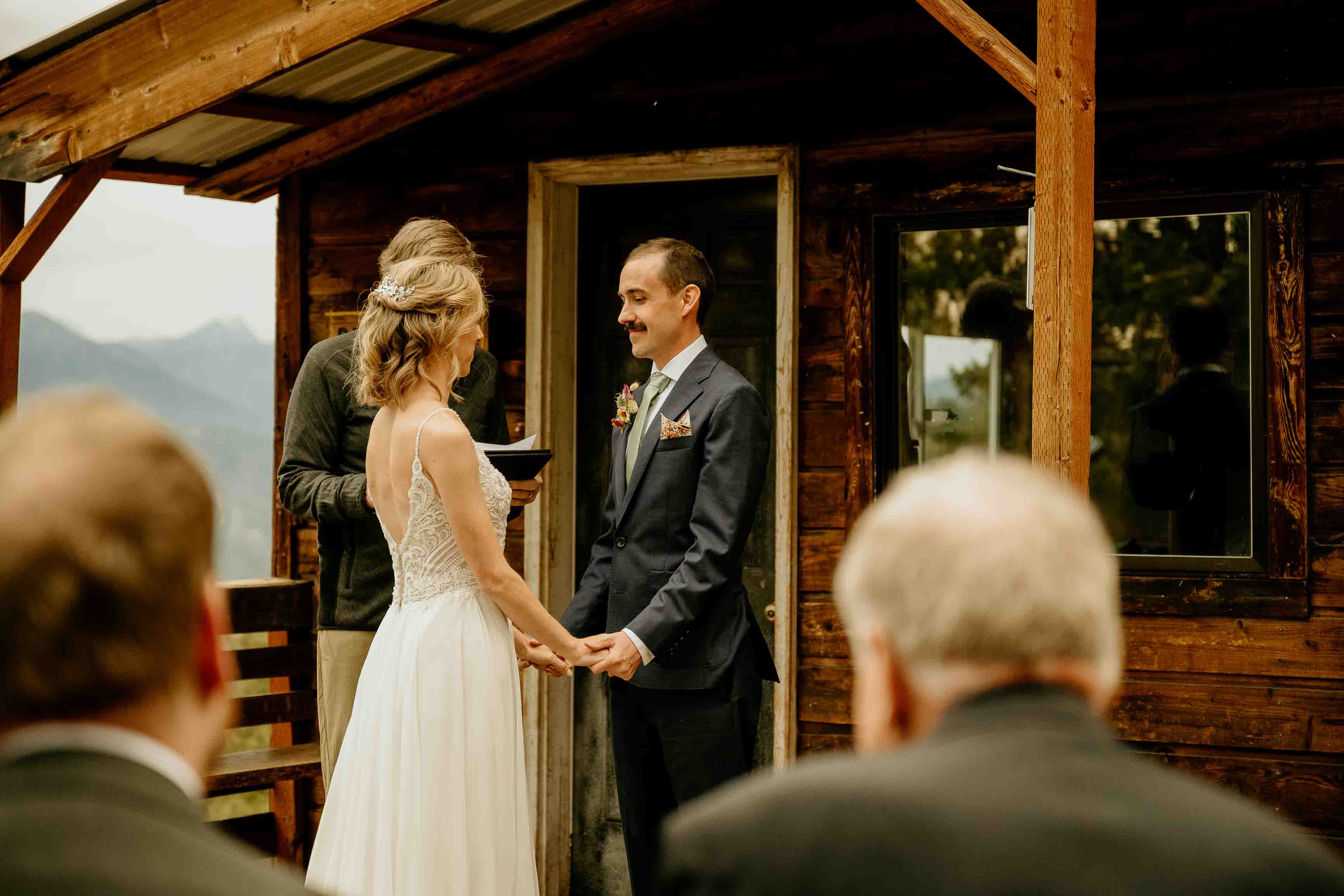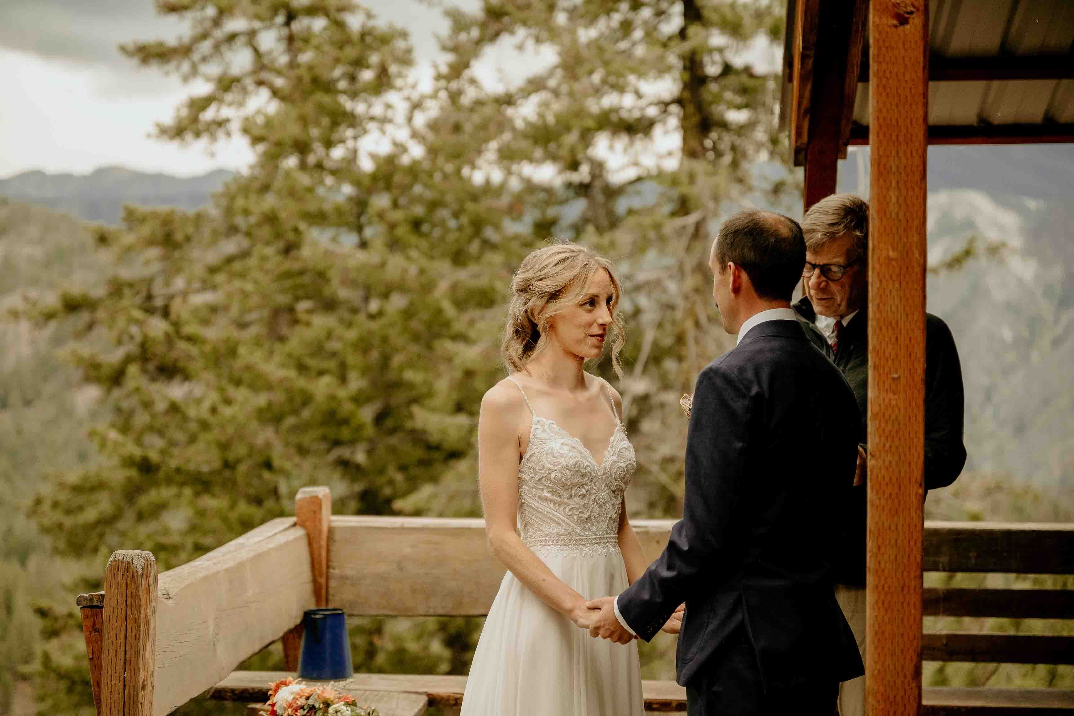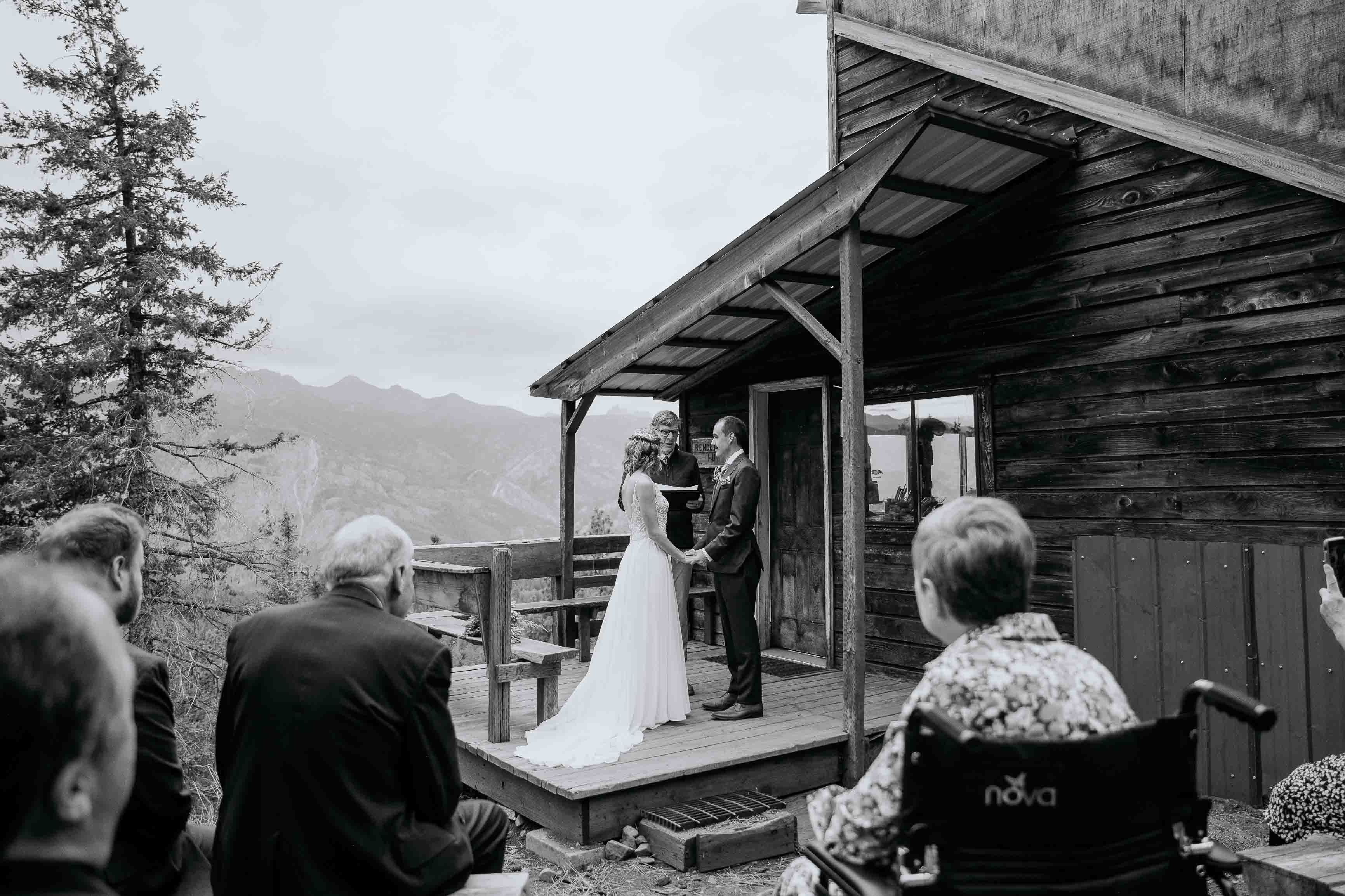 Their ceremony took place at the top of Rendezvous Hut Trail, one of the most scenic locations near Winthrop in the North Cascades. Lizzy and Josh exchanged vows with a small group of their closest family and friends present, keeping the focus on connection and the significance of the moment rather than a large production.